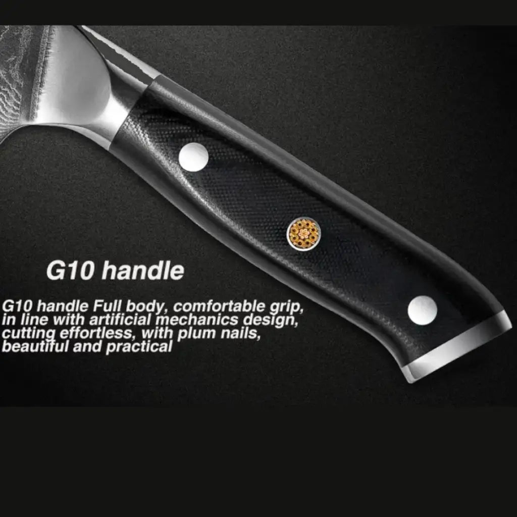 The triple riveted black G-10 handle is flawlessly and ergonomically constructed ensuring strength and durability that enhances your cutting, precision, and control. Add elegance and charm to your dining room and impress your guests with these beautiful knives.